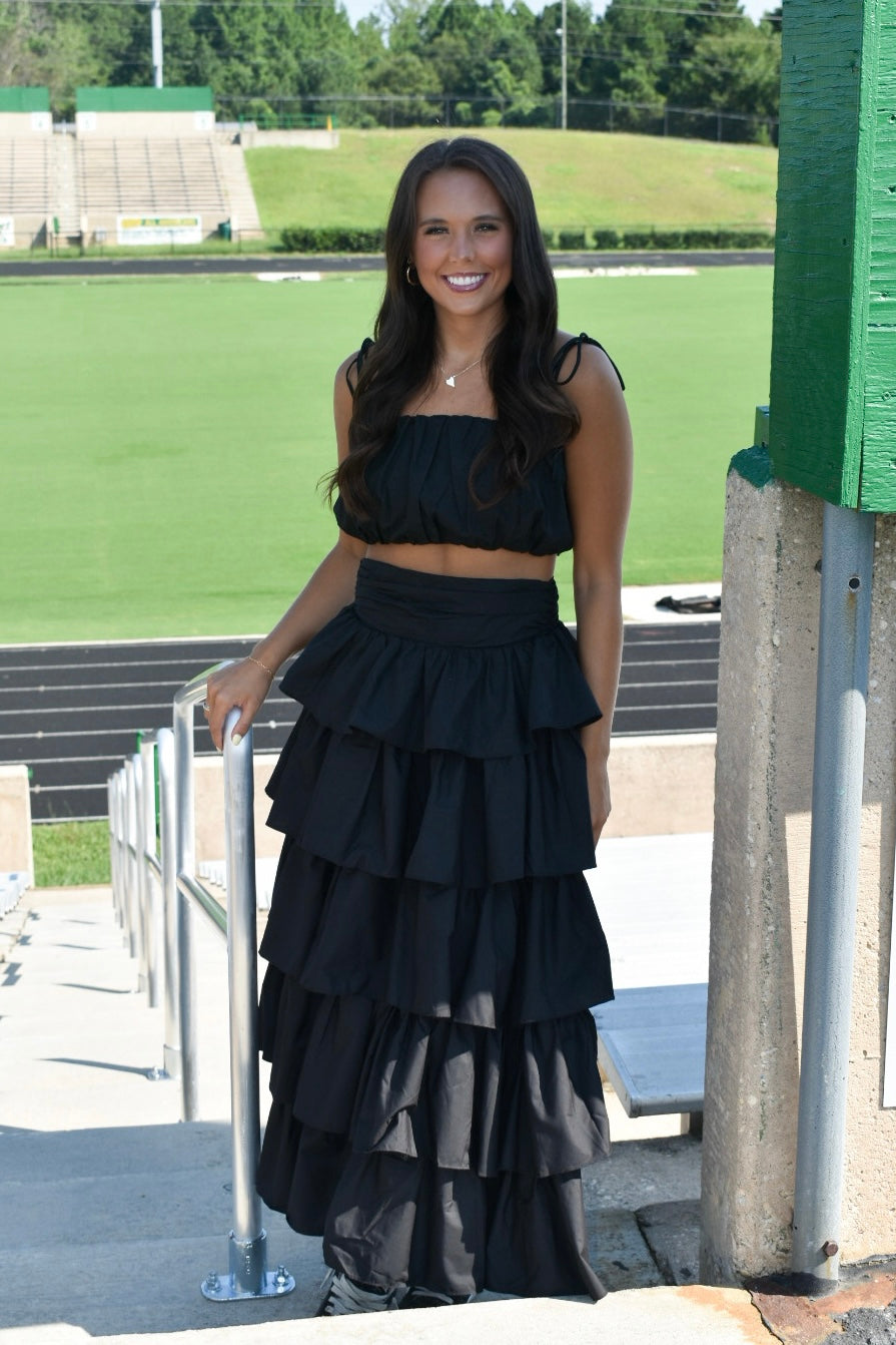 This stunning two-piece set features a crop top with adjustable tie straps and a dramatic tiered maxi skirt. Ragan is in a size medium.